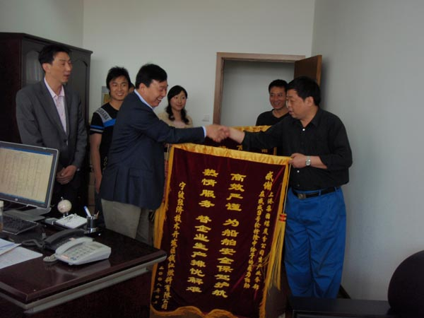 5月5日,上海浙浦电力燃料有限公司董事长陈柏盛,总经理毛伟力率 公司员工专程来到位于罗泾的上港集团煤炭分公司,将一面绣有“ 高效 严谨为船舶安全保驾护航,热情服务替企业生产排忧解难 ”的锦旗送到 公司领导手中,感谢公司生产业务部和朱家门管理处在“ 盛威9号 ”轮 抢险中给予的鼎力相助。
